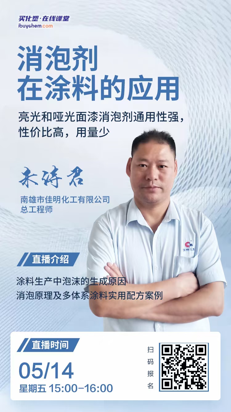 5月14日南雄市佳明化工有限公司總工程師朱詩君將做客買化塑在線課堂,分享消泡劑的消泡